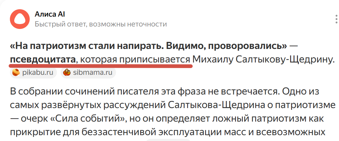 Чтобы доказать убожество русского патриотизма, либералы постоянно используют фальшивую цитату писателя Михаила Салтыкова-Щедрина, и профессиональный литератор Рубинштейн среди них. Однако ни он, ни кто-либо другой так и не указал произведение, из которого взята фраза, потому что такового нет. Досконально разобрав тему, историк Игорь Петров нашёл лишь рассуждения Михаила Евграфовича в статье «Сила событий». Где тот, описывая воров и прохвостов, именующих себя патриотами, приводил примеры из жизни Франции, только что проигравшей войну Германии.